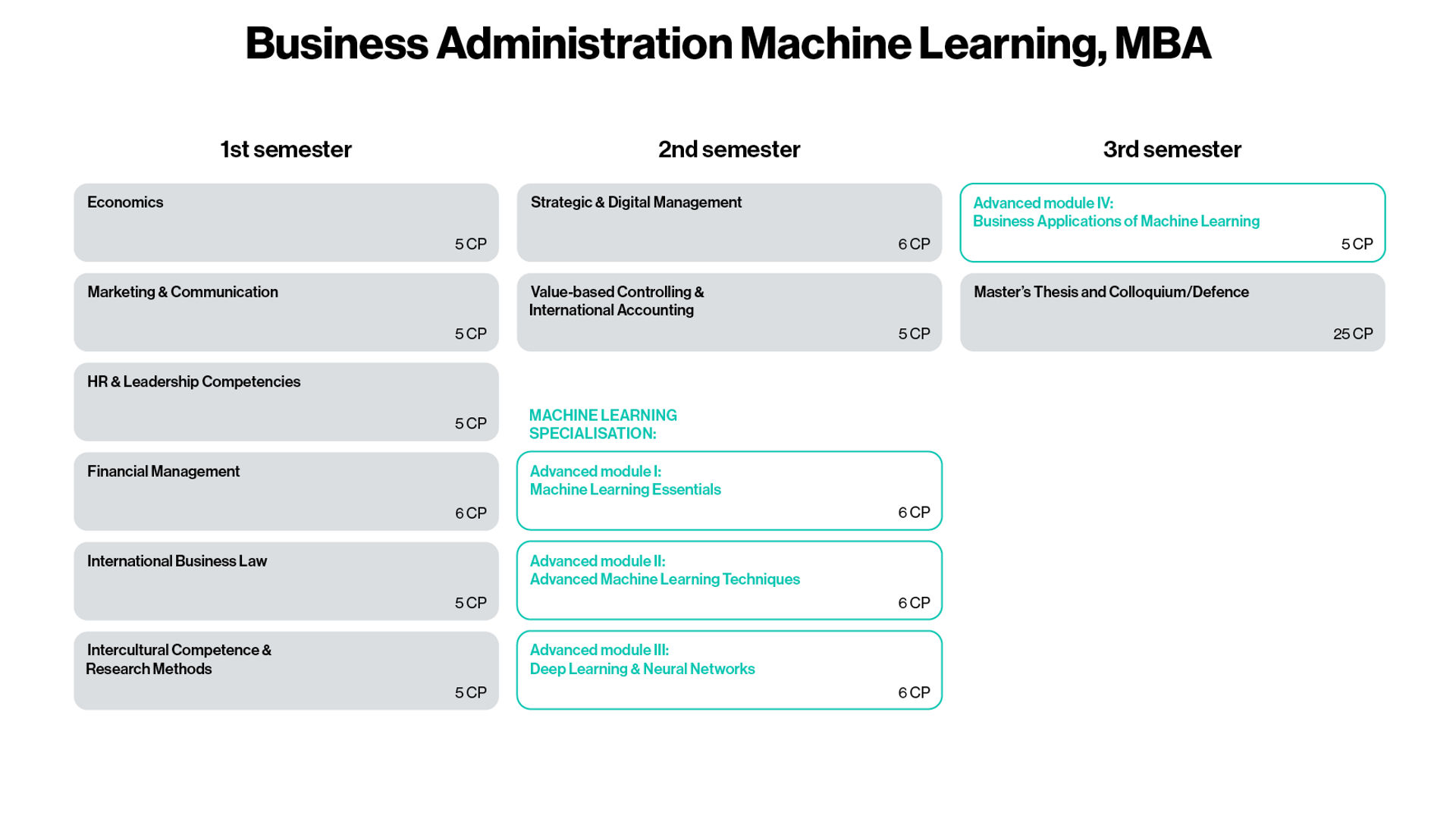 In our Master’s degree programme “Business Administration Machine Learning (MBA)” you will be expanding your academic knowledge, gaining specialist subject and methodological understanding and further broadening your decision-making and leadership skills. You study full-time on the campus in Munich. You also have the opportunity to establish initial contacts with companies. During this time, you will have experienced, highly qualified professors and lecturers who will also provide you with individual support.